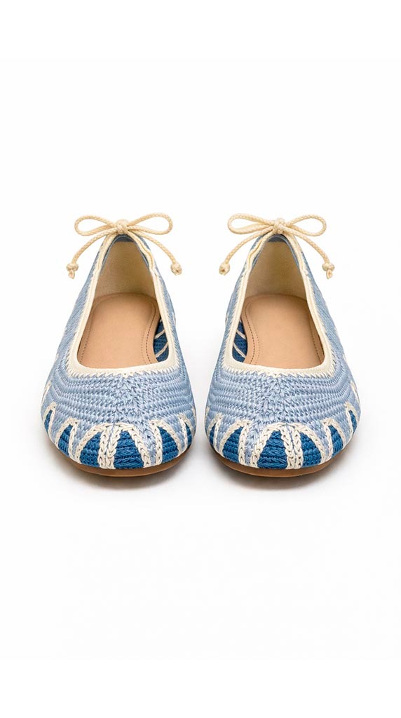 Bailarina plana de diseño artesanal en tono azul, con acabado en punto trenzado que aporta textura y un aire fresco y veraniego. Su silueta clásica se actualiza con el detalle de la lazada trasera, que añade un toque delicado y femenino.