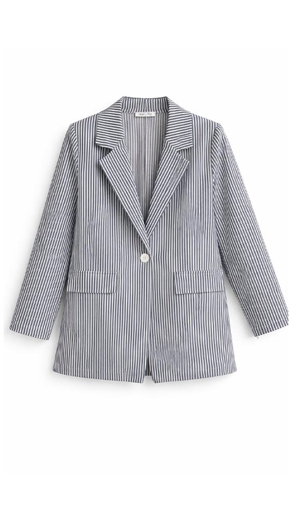 La Blazer Sastre Rayas Marino es una prenda elegante y muy versátil que combina el estilo clásico del sastre con un aire fresco y moderno. Su diseño con solapa clásica y cierre de un botón crea una silueta estilizada y muy favorecedora.