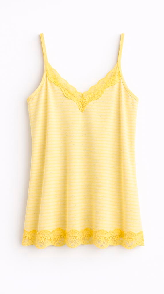 Camiseta de tirantes en tono amarillo suave con detalle de encaje en escote y bajo, una prenda luminosa que aporta frescura inmediata al look.