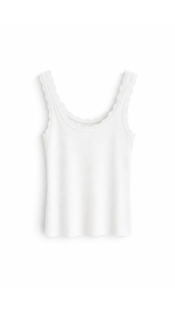 Destaca por su escote redondeado con acabado ondulado, un detalle delicado que añade un toque femenino y especial a la prenda. Los tirantes anchos proporcionan mayor sujeción y equilibrio al diseño, convirtiéndola en una camiseta perfecta para llevar tanto sola como bajo blazers, chaquetas o camisas.