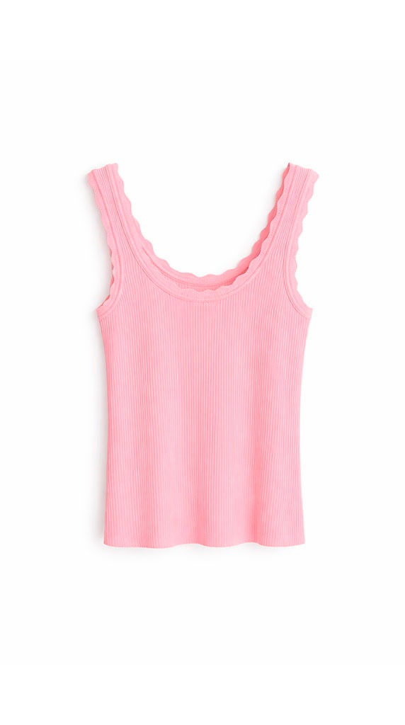 Destaca por su escote redondeado con acabado ondulado, un detalle delicado que añade un toque femenino y especial a la prenda. Los tirantes anchos proporcionan mayor sujeción y equilibrio al diseño, convirtiéndola en una camiseta perfecta para llevar tanto sola como bajo blazers, chaquetas o camisas.