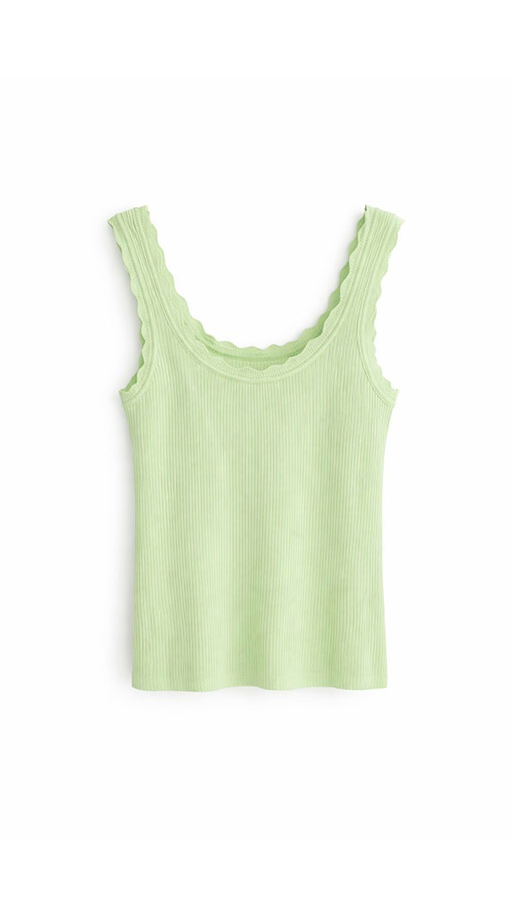 Destaca por su escote redondeado con acabado ondulado, un detalle delicado que añade un toque femenino y especial a la prenda. Los tirantes anchos proporcionan mayor sujeción y equilibrio al diseño, convirtiéndola en una camiseta perfecta para llevar tanto sola como bajo blazers, chaquetas o camisas.