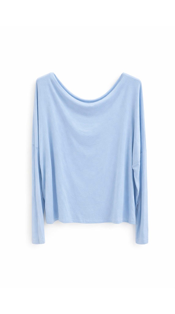 La camiseta Zaya en color celeste es fresca, delicada y muy favorecedora. Un tono suave que aporta luz al rostro y transmite sensación de ligereza, ideal para looks relajados pero cuidados.