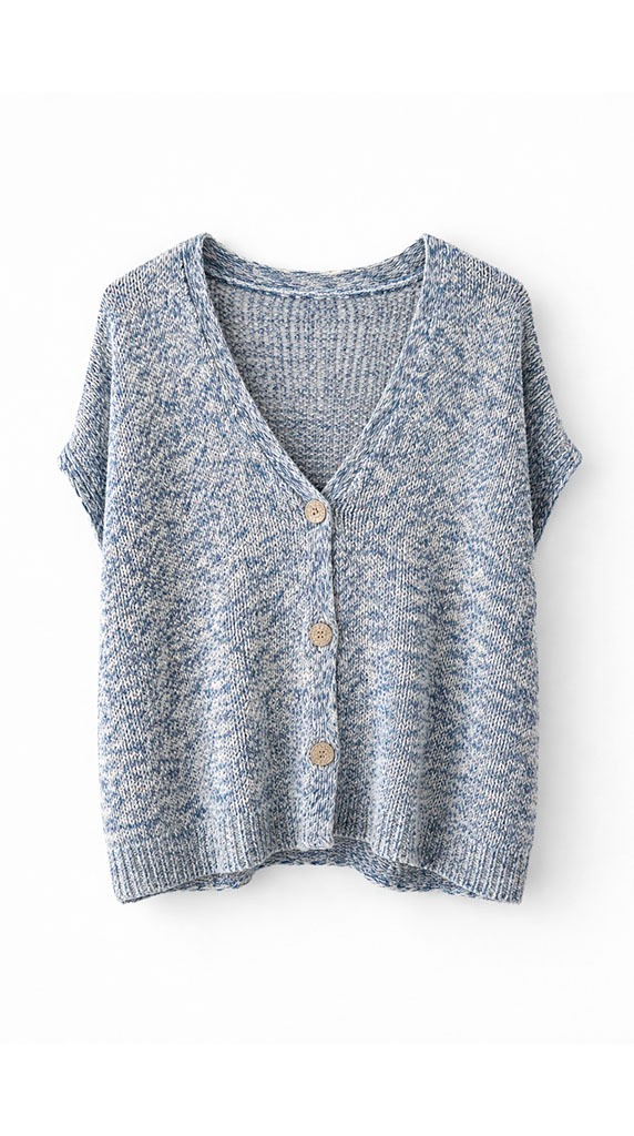 El chaleco Bologna en tono azul jaspeado es una prenda ligera y muy favorecedora que aporta textura y un toque especial a cualquier look. Su mezcla de tonos crea un efecto visual muy elegante que combina fácilmente con prendas neutras, denim o blancos.