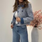 La chaqueta London en blanco con detalles en azul es una opción luminosa y elegante, perfecta para looks frescos y sofisticados. Su tejido tipo tweed aporta textura y estructura, mientras que el cuello camisero y los botones forrados en azul añaden un contraste delicado que realza el diseño. El largo a la cintura y el corte recto favorecen la silueta y permiten múltiples combinaciones, tanto con prendas claras como con tonos más intensos.