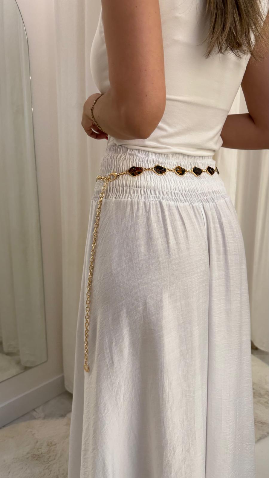 Cinturón tipo cadena con piezas efecto carey que aporta un toque sofisticado y muy estiloso a cualquier look. Su diseño fino con detalles dorados ilumina la zona de la cintura y añade un punto elegante sin recargar.
