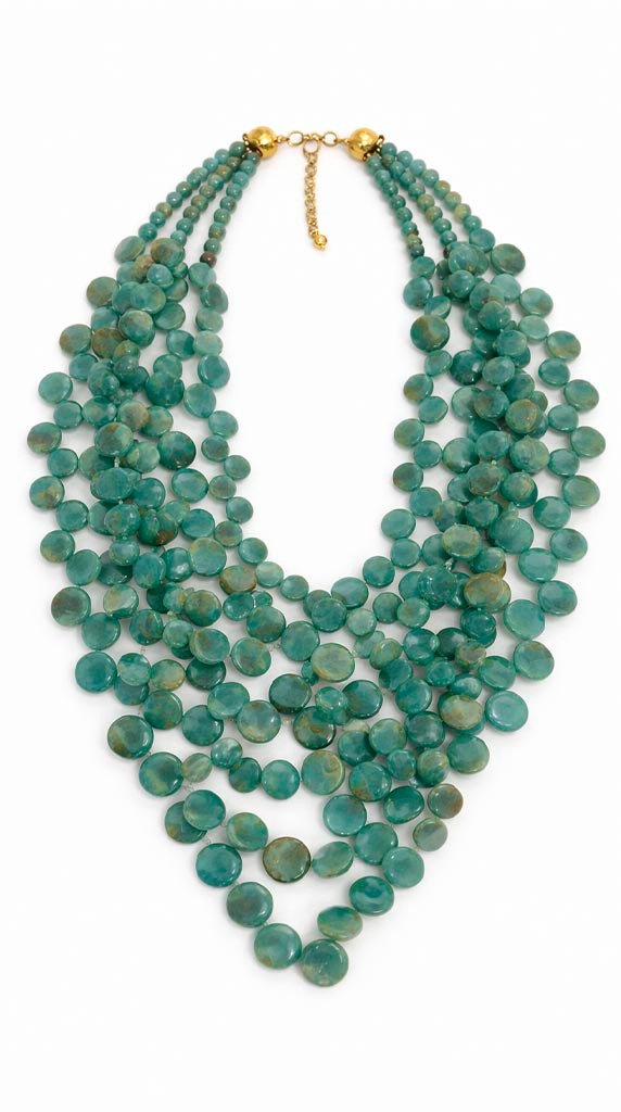 Collar de diseño llamativo en tono verde jade con acabado translúcido y sutil efecto marmoleado, que aporta frescura, luz y un toque sofisticado al look. Su composición de múltiples piezas en forma orgánica crea volumen y movimiento, convirtiéndolo en una pieza protagonista.