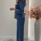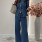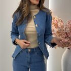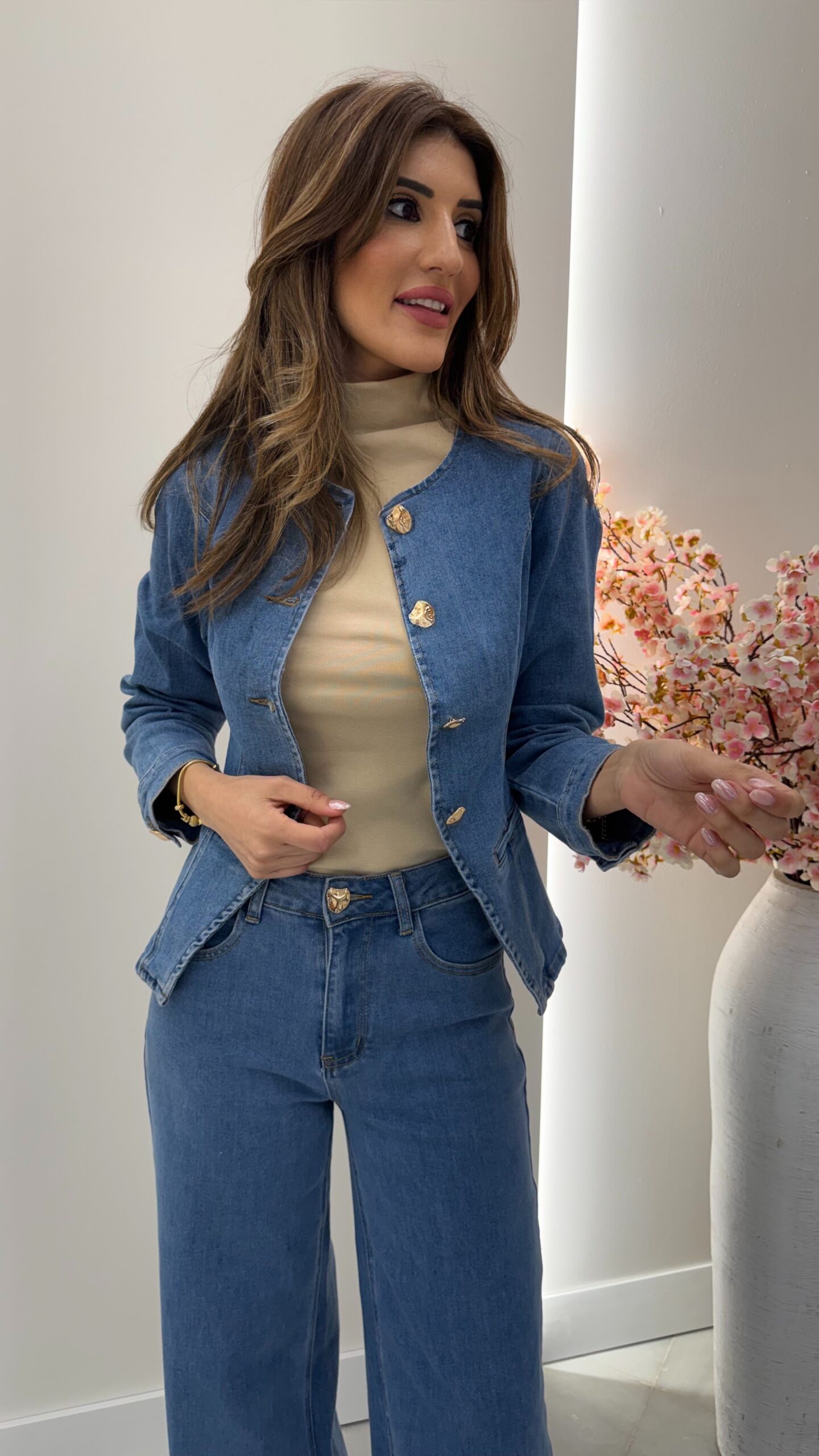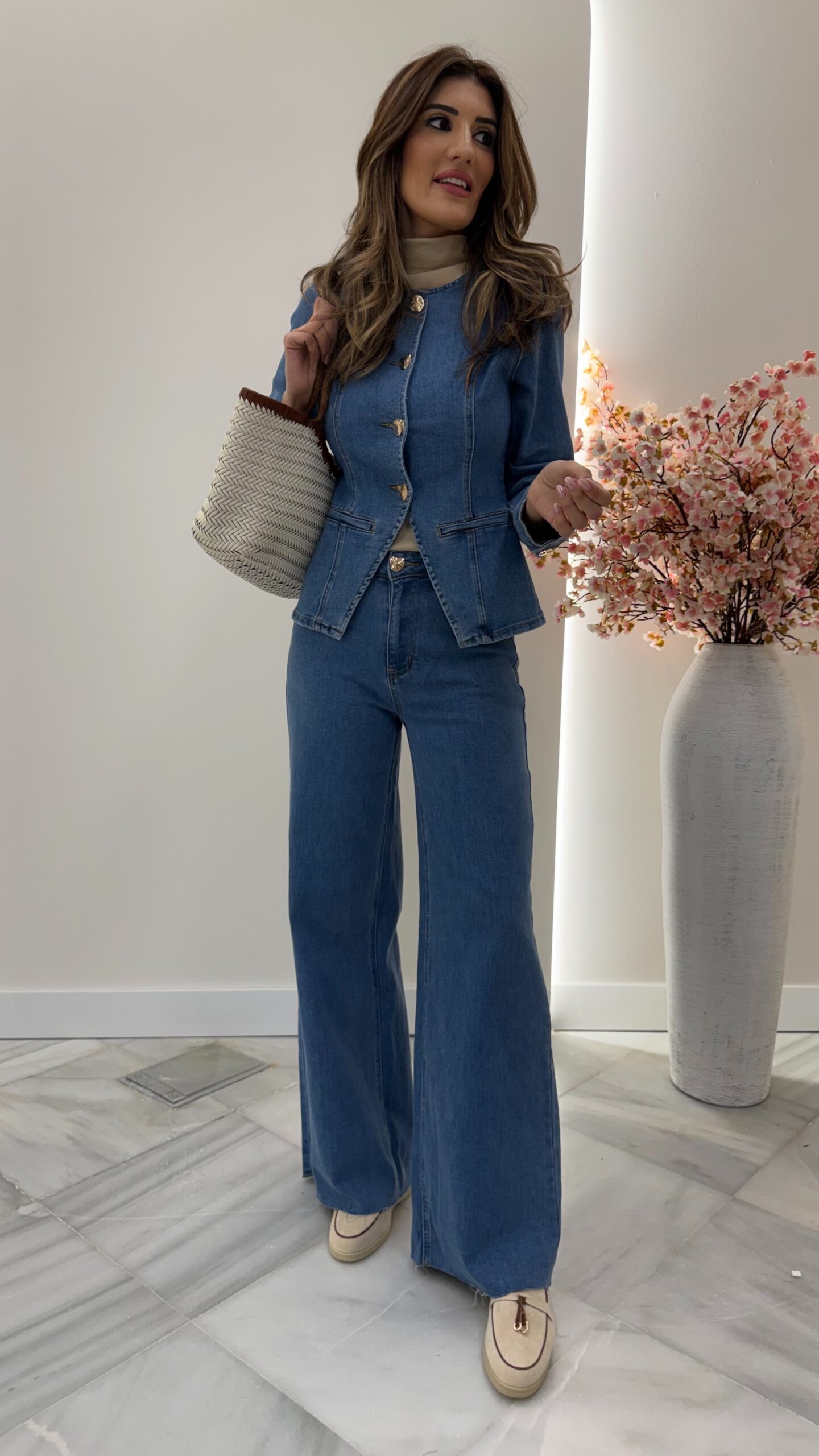 Conjunto denim de inspiración contemporánea que combina estructura y comodidad en una silueta muy favorecedora. La parte superior, tipo chaqueta corta, presenta un diseño entallado con costuras marcadas que estilizan el torso, cierre frontal con botones joya en tono dorado y bolsillos decorativos que aportan un acabado elegante al denim clásico.