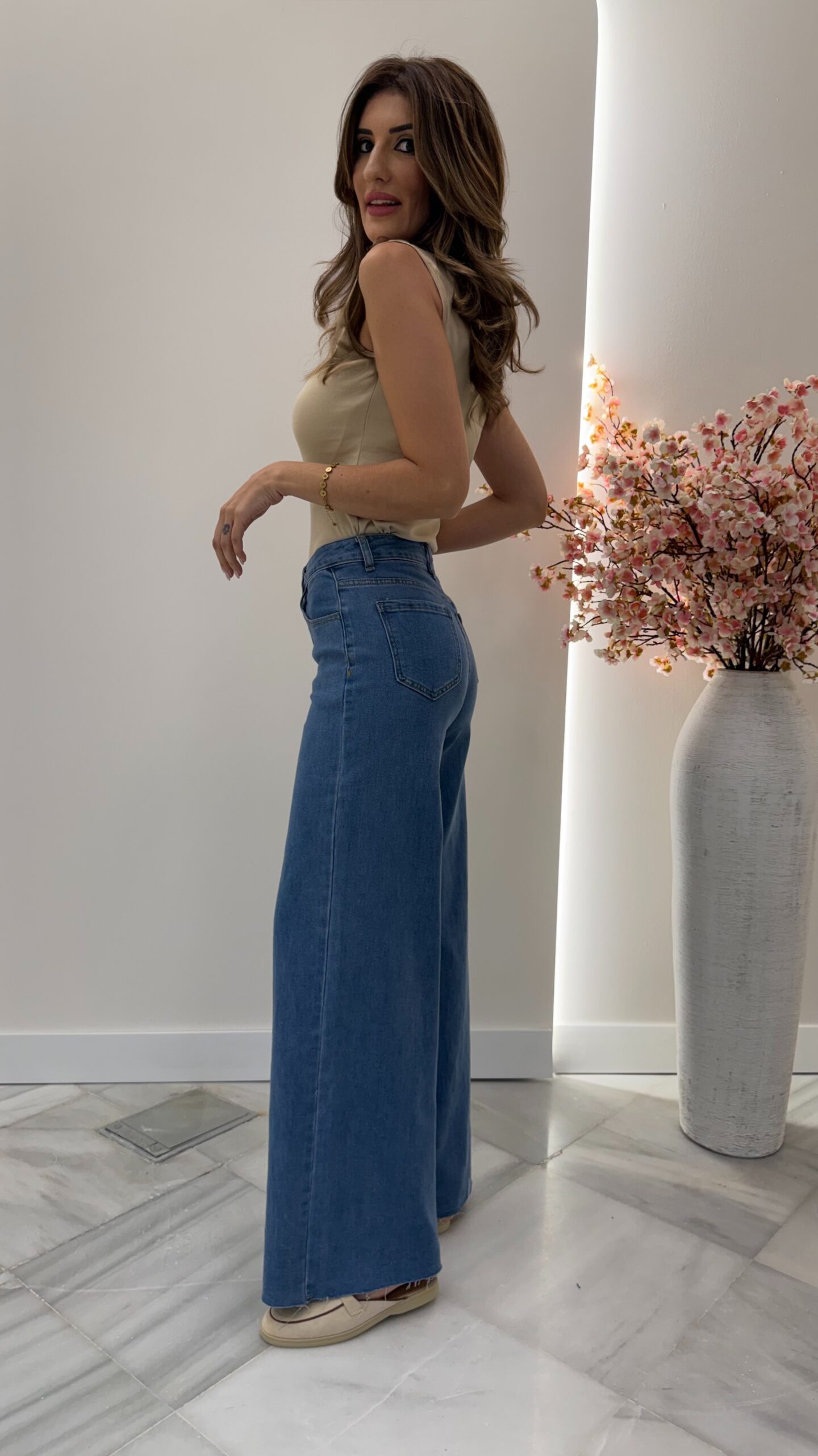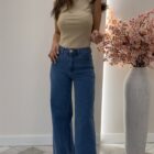 El pantalón de tiro medio–alto destaca por su pernera amplia y caída recta, aportando equilibrio y movimiento al conjunto. Su patrón está pensado para alargar visualmente la figura, manteniendo la comodidad gracias a su tejido ligeramente elástico.