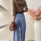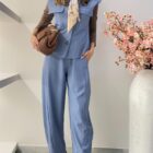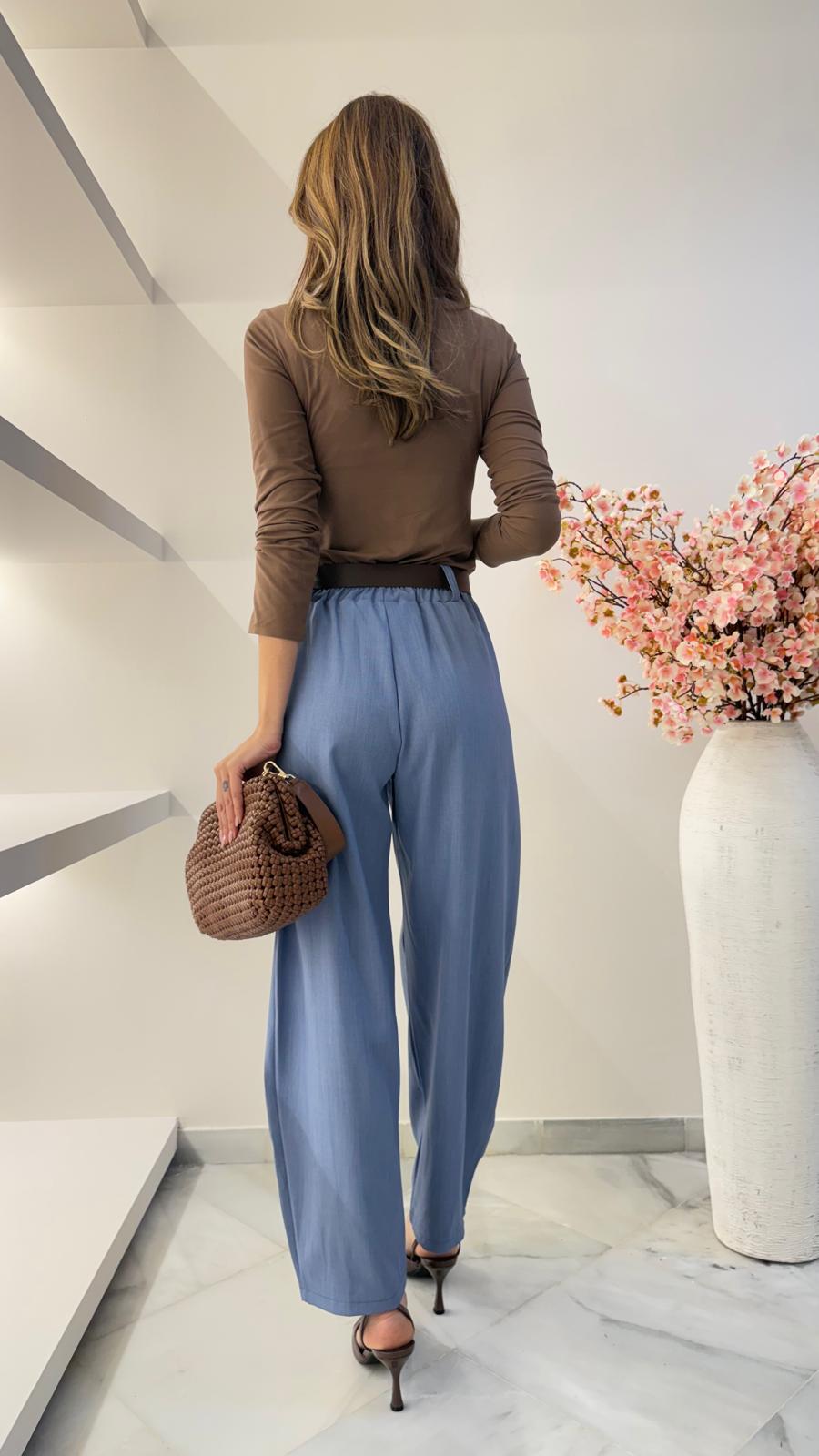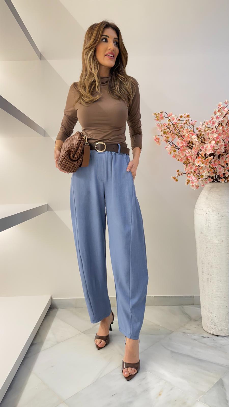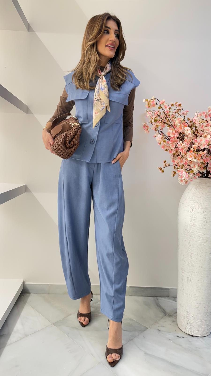 El conjunto Denver en color azul destaca por su aire relajado y actual. Un tono sereno y muy favorecedor que aporta equilibrio al look, ideal para quienes buscan comodidad sin renunciar al estilo. El pantalón tipo balloon añade volumen controlado y un efecto moderno que estiliza el conjunto.