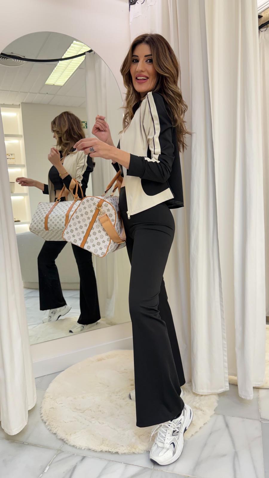 Conjunto de tres piezas en negro con detalle lateral en contraste que estiliza visualmente la silueta. Un diseño cómodo, elástico y muy favorecedor que recoge sin marcar y define la figura.