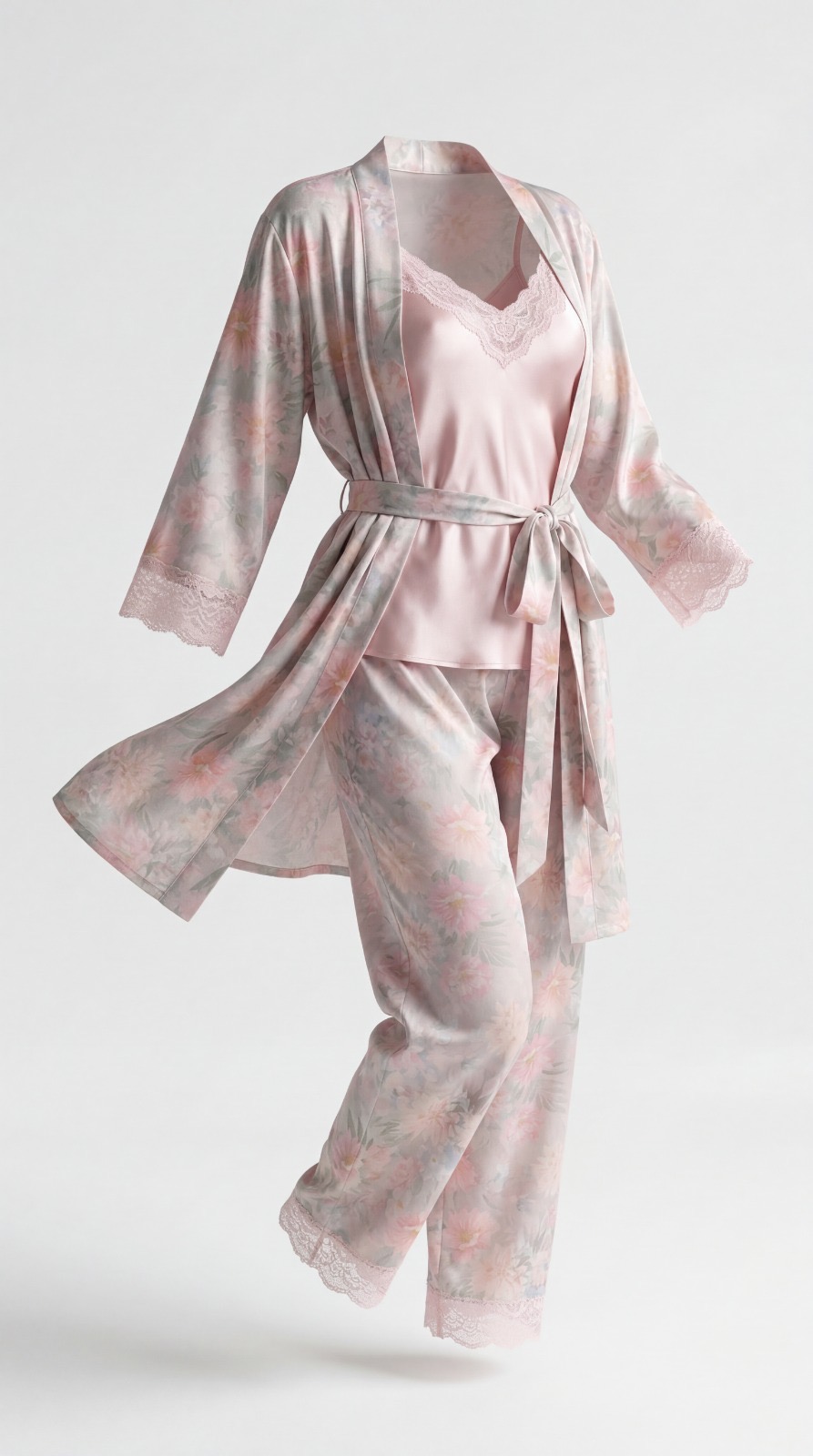 El kimono floral completa el conjunto con un diseño envolvente muy sofisticado. Su estampado en tonos pastel y las mangas rematadas en encaje aportan un toque romántico y elegante. Incluye cinturón para ajustar a la cintura y poder llevarlo abierto o cerrado.