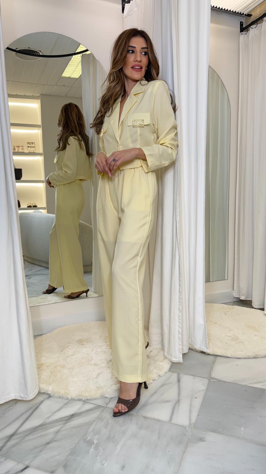 El conjunto Malibú en amarillo es una propuesta elegante y fresca que estiliza de forma natural. La chaqueta cropped con solapa marcada y detalle dorado en los bolsillos aporta estructura y personalidad, mientras que el pantalón de tiro alto y caída fluida equilibra la silueta y alarga visualmente la pierna.