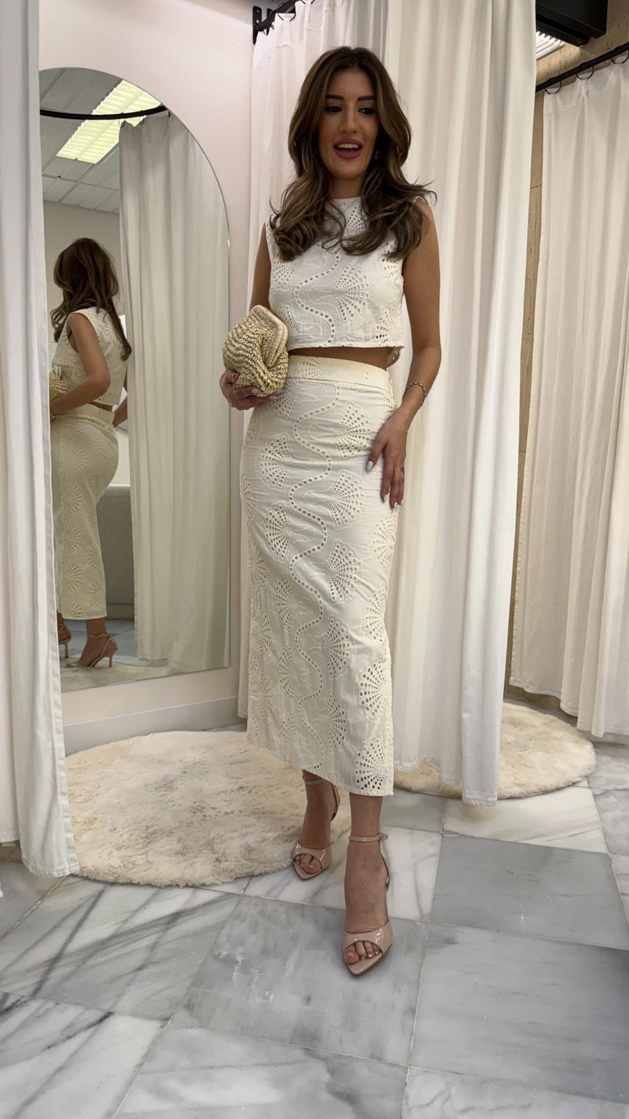 La falda midi destaca por su bordado calado floral que aporta movimiento y sofisticación al look. Su caída fluida estiliza la silueta y crea un conjunto muy favorecedor y elegante.