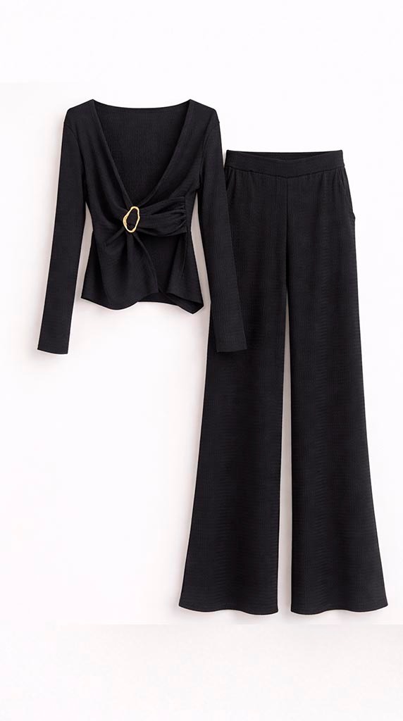 El pantalón, de corte amplio y cintura elástica, ofrece un ajuste cómodo y adaptable. Su diseño ayuda a alargar visualmente la figura y aporta una caída fluida muy elegante, creando un conjunto armonioso y favorecedor.