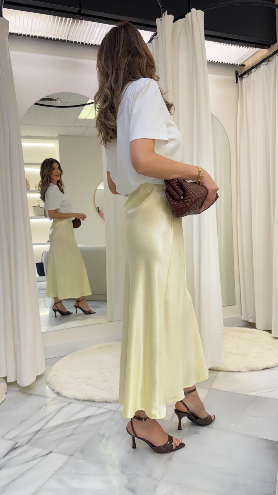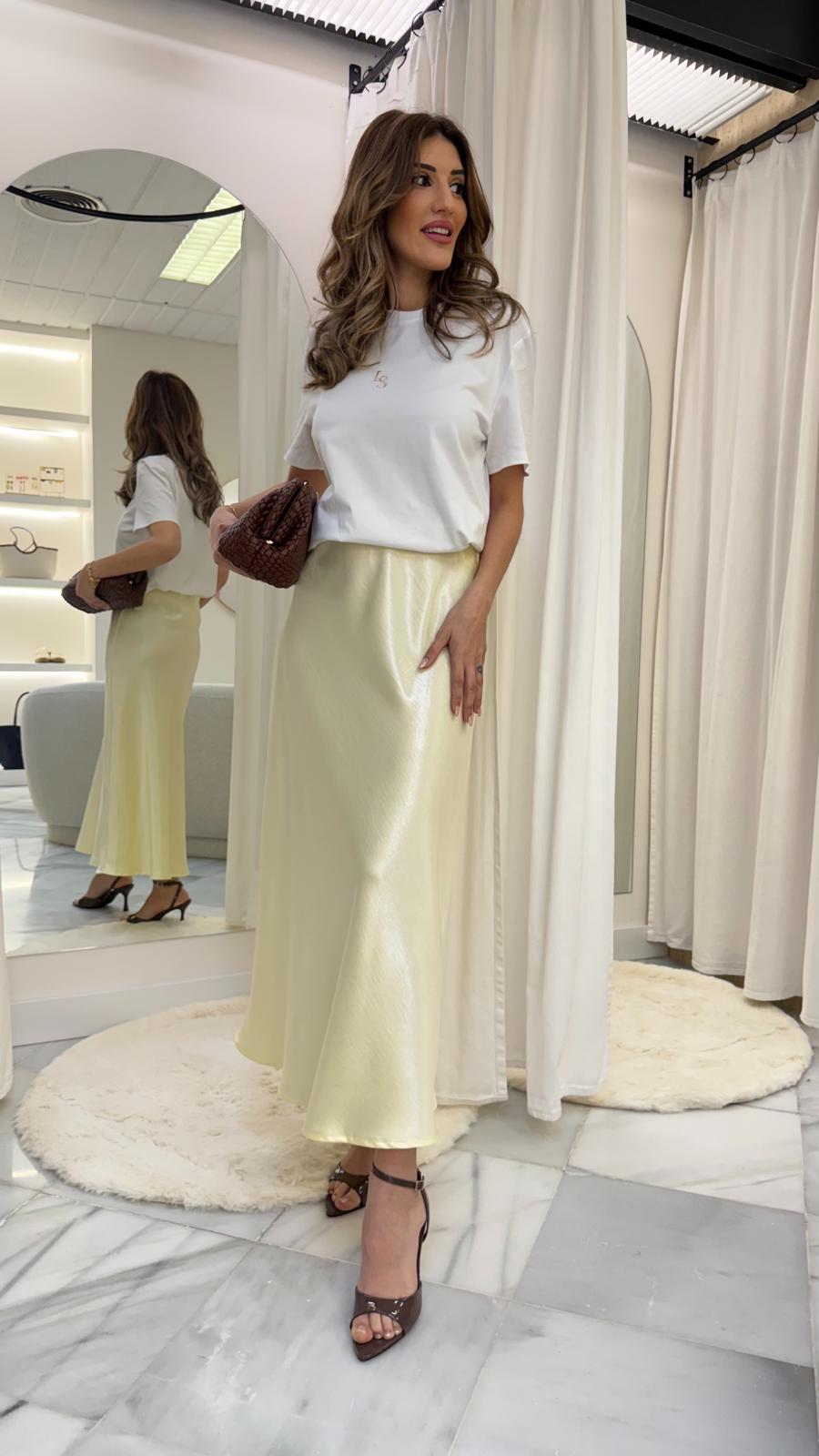 Falda larga en tono amarillo suave, luminosa y muy favorecedora. Su tejido con caída fluida estiliza la silueta y aporta movimiento al caminar. Perfecta para combinar con blusas especiales o prendas básicas y conseguir un look elegante, fresco y muy femenino.