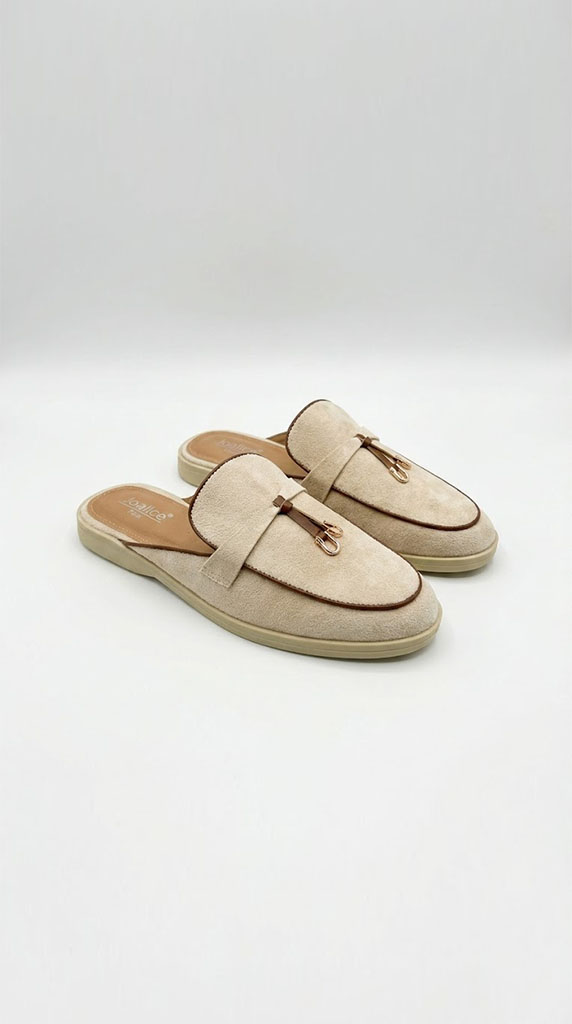 Mule plana de estilo elegante y atemporal, ideal para completar looks cómodos sin renunciar al estilo. Confeccionada en acabado efecto ante en tono beige, destaca por su diseño limpio con puntera ligeramente afilada y ribete en contraste que define la silueta del zapato. Incorpora un detalle decorativo frontal con aplique metálico dorado que aporta un toque sofisticado y femenino.