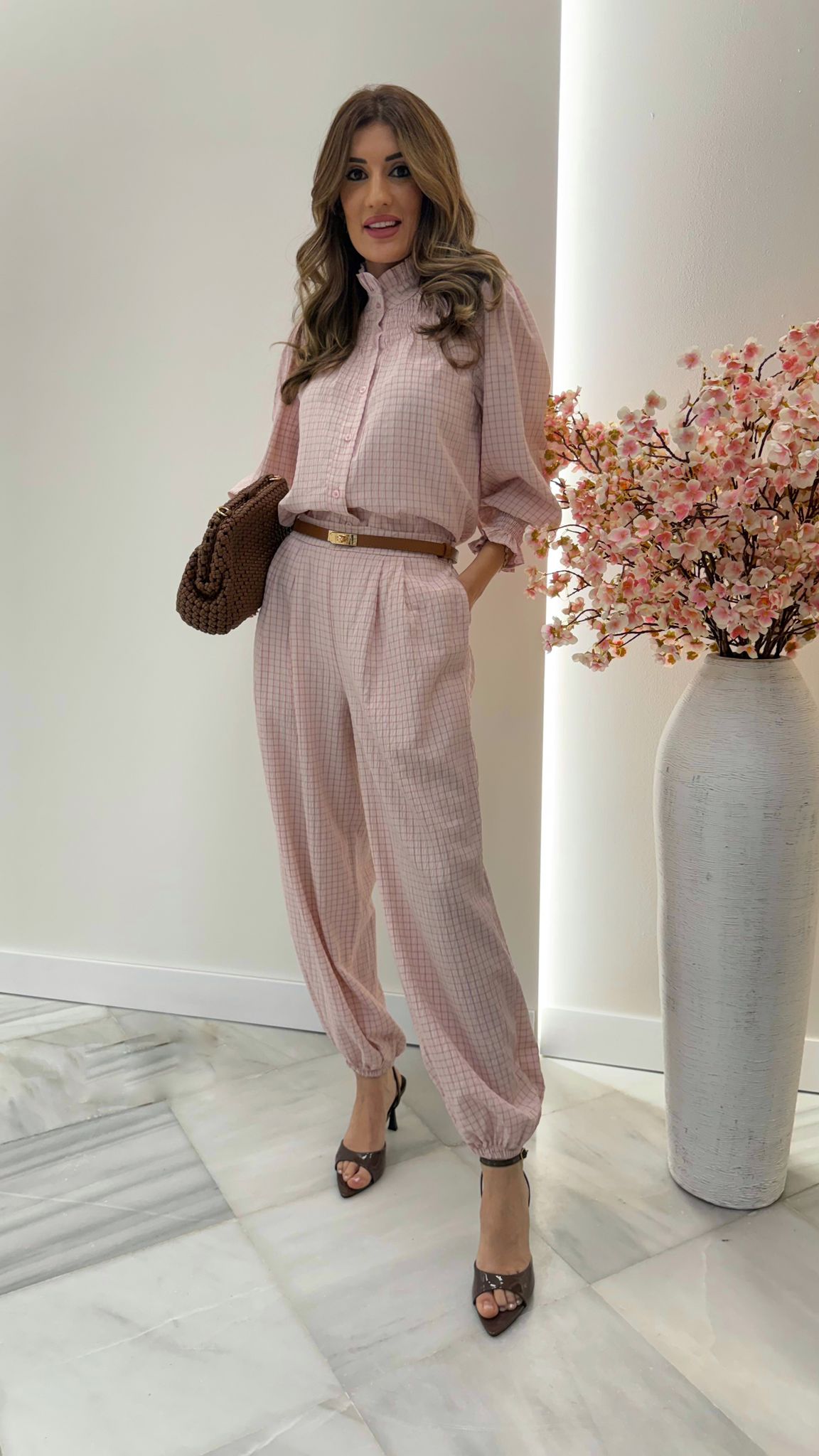 Pantalón fluido de inspiración parisina confeccionado en un tejido ligero y suave, que aporta movimiento y elegancia natural al caminar. Su delicado estampado de cuadro fino mantiene una estética sofisticada y atemporal, ideal para looks relajados pero con un punto muy cuidado.