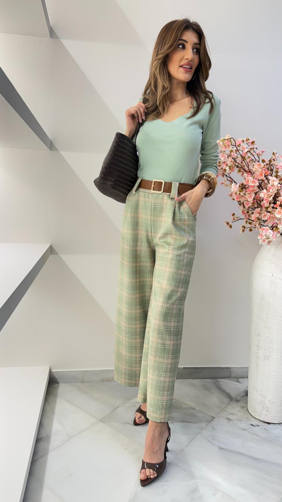 En color verde, este pantalón de cuadros transmite naturalidad y sofisticación. Es una opción muy versátil para combinar con tonos neutros, beige o blancos, perfecta tanto para looks diarios como para estilismos más arreglados. Su tejido elástico garantiza confort sin perder estructura.