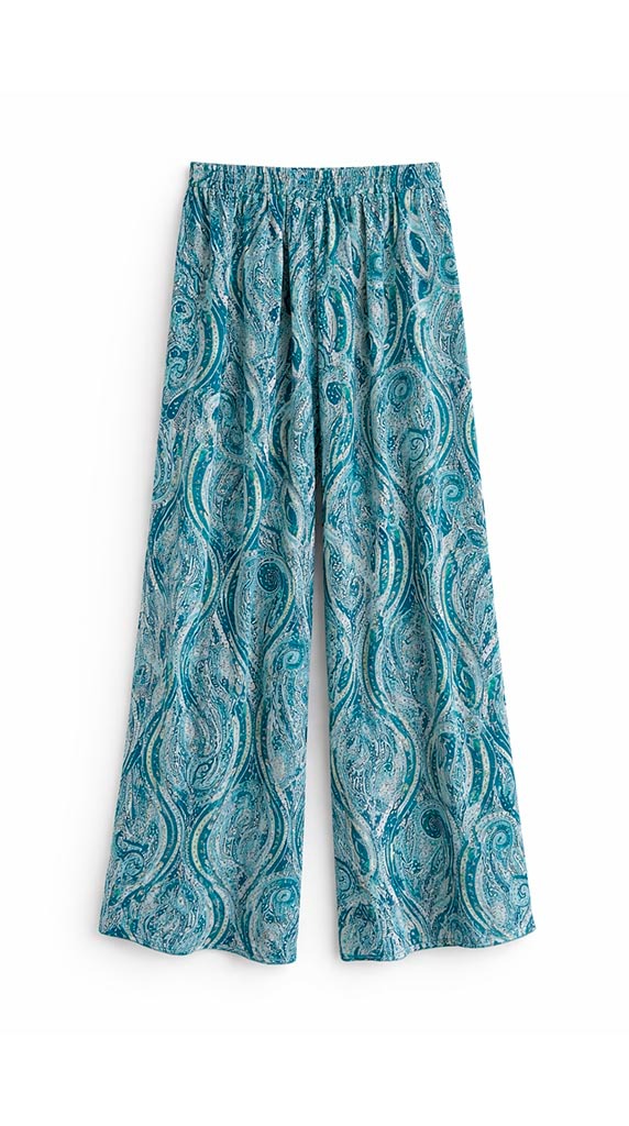 Pantalón de corte amplio y caída fluida con estampado paisley en tonos verdes y azules que aporta un aire sofisticado y muy especial al look. Su diseño estiliza la silueta gracias a su línea recta y al movimiento ligero del tejido.