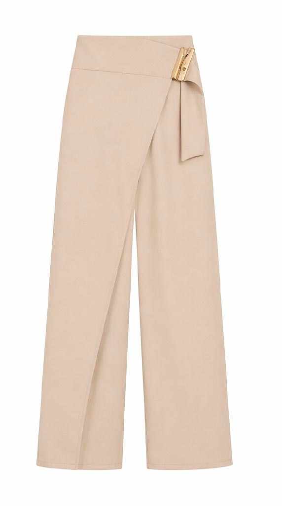 Pantalón de corte recto con diseño elegante y estructurado, ideal para estilizar la silueta y alargar visualmente la pierna. Su detalle cruzado en la cintura con aplicación dorada aporta un toque sofisticado y diferencial.