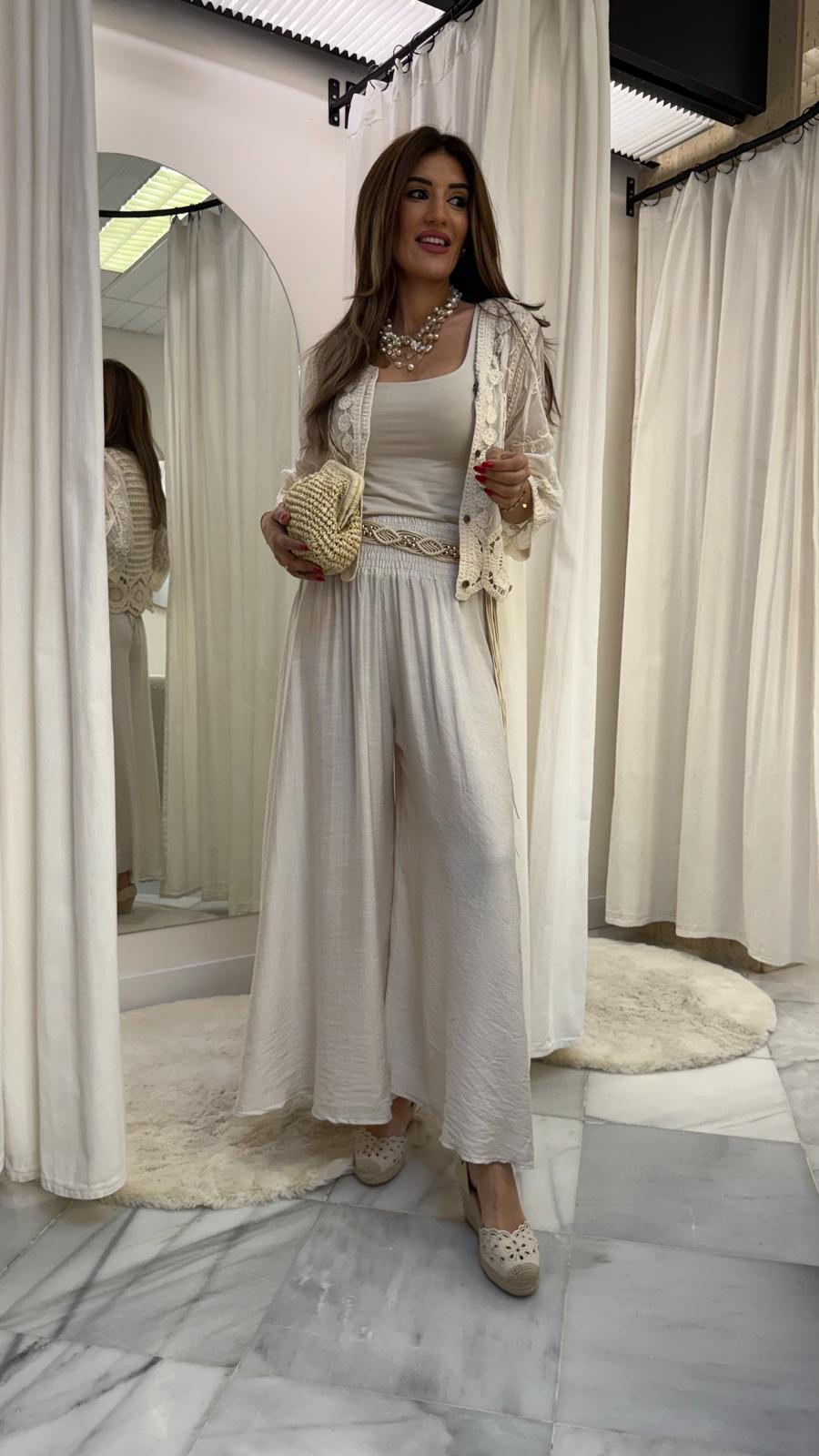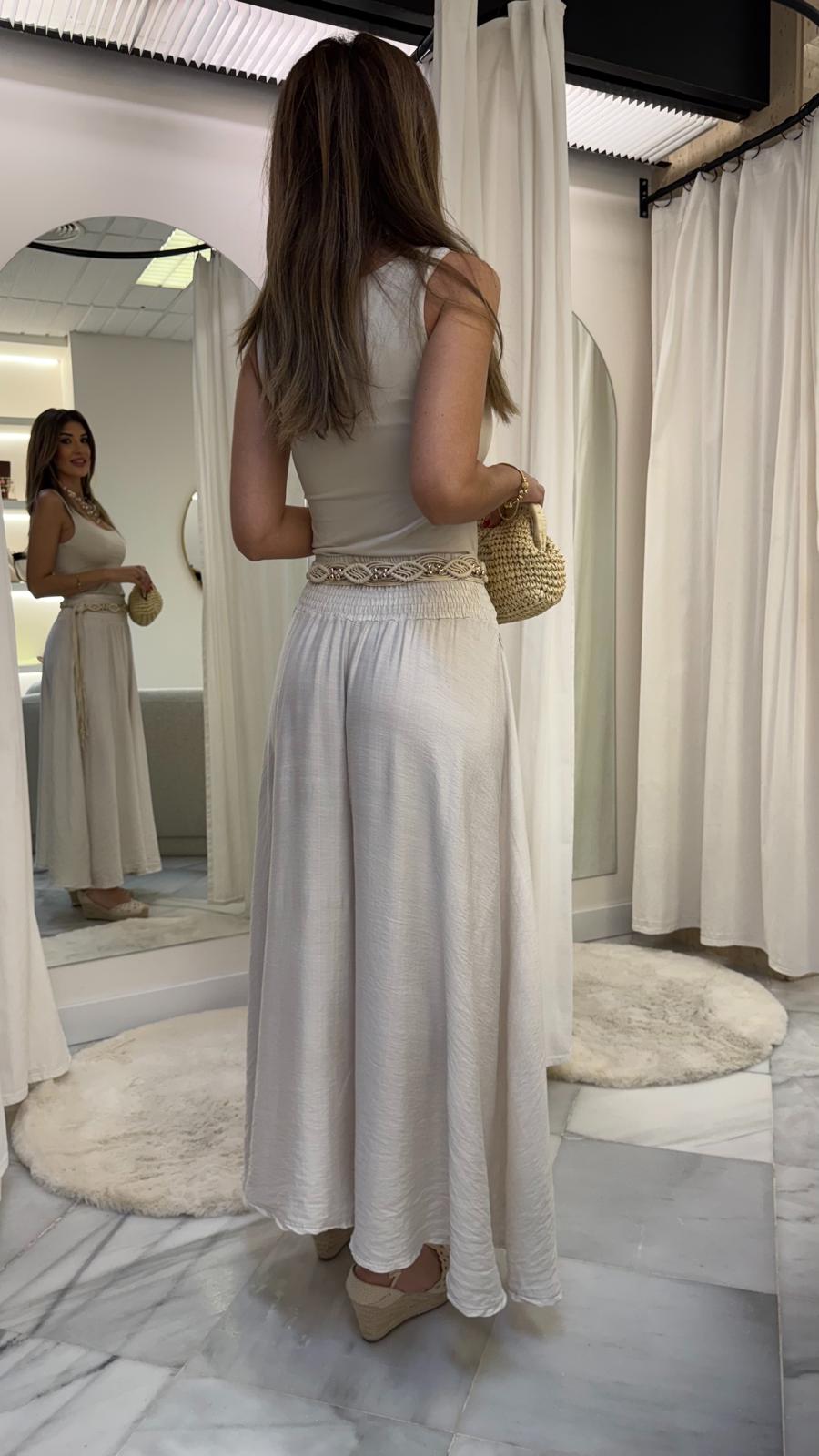 Pantalón fluido de tejido ligero con caída suave, perfecto para estilizar sin esfuerzo. Su cintura elástica fruncida se adapta cómodamente al cuerpo, aportando sujeción sin apretar.