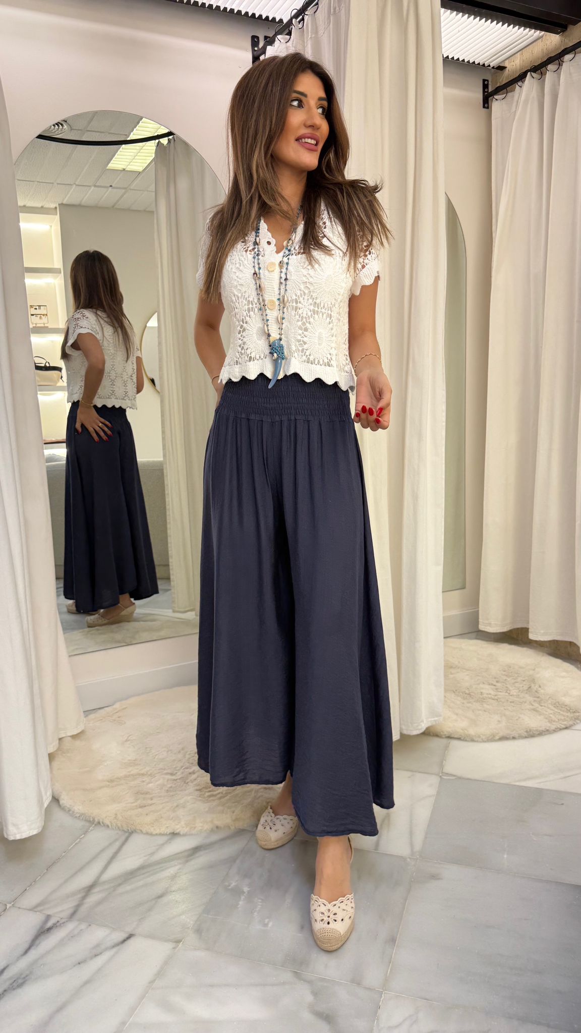 Pantalón fluido de tejido ligero con caída elegante, diseñado para estilizar la silueta sin marcar. Su cintura elástica fruncida se adapta perfectamente, aportando comodidad y sujeción.