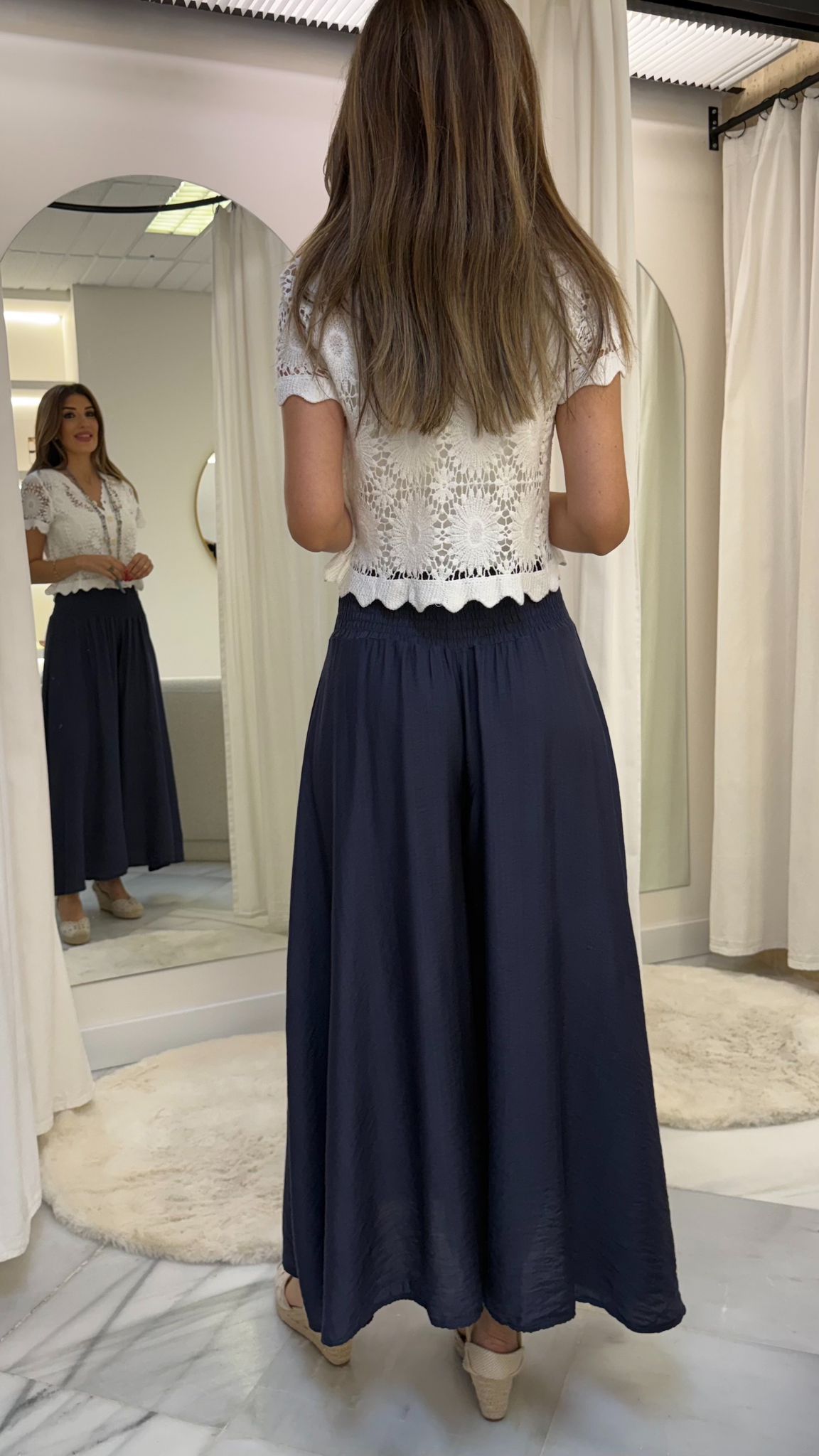 El corte amplio y recto alarga visualmente la pierna, creando un efecto más estilizado y equilibrado. El tono marino lo convierte en un básico atemporal, fácil de combinar y perfecto para elevar cualquier look.