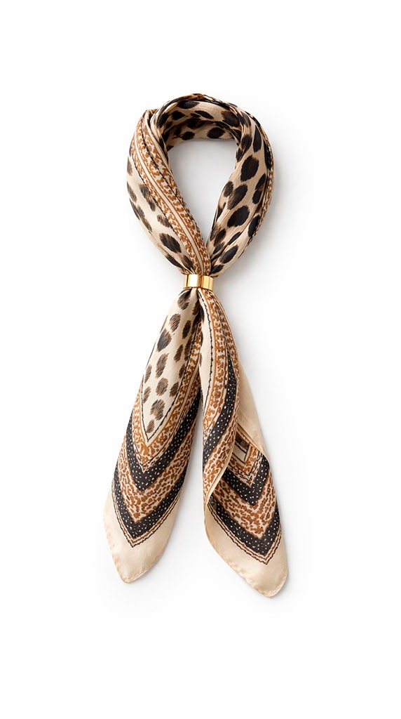 Su tejido ligero y suave permite llevarlo al cuello, anudado al bolso o como detalle en el cabello, aportando siempre un aire sofisticado y actual. El contraste de estampados y el acabado satinado elevan el conjunto sin resultar excesivo.