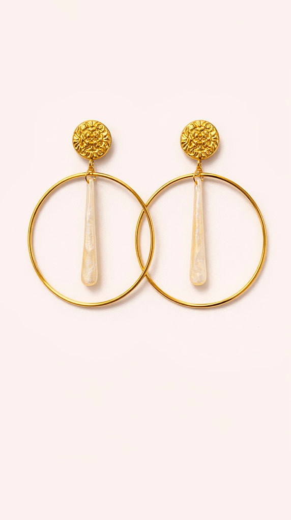 Destacan por su estructura ligera con aro dorado y pieza central alargada en efecto nácar, que añade movimiento y un toque luminoso muy elegante. El detalle superior con textura grabada aporta personalidad y un acabado especial al diseño.