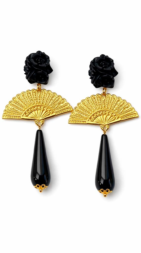 Pendientes de diseño especial que combinan el contraste del negro con el dorado, creando un efecto elegante y con mucha personalidad. La pieza superior en forma de flor aporta un toque femenino, mientras que el detalle de abanico añade ese aire flamenco tan característico.