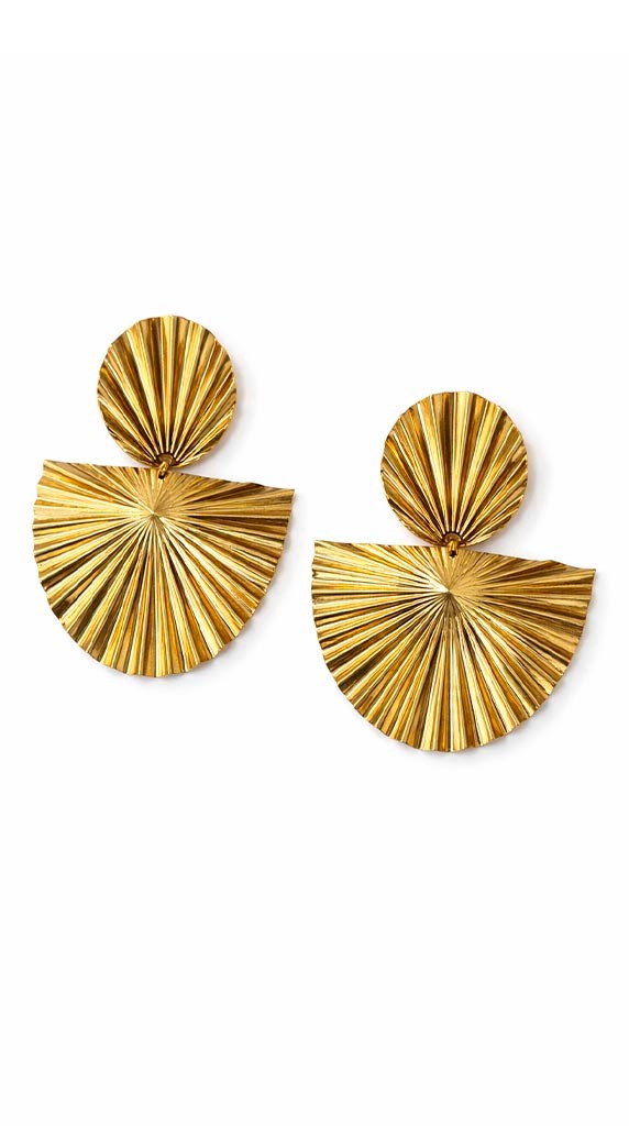Pendientes de diseño en abanico con acabado dorado que aportan luz al rostro al instante. Su forma estructurada en doble pieza crea un efecto visual muy favorecedor, estilizando el cuello y elevando cualquier look.