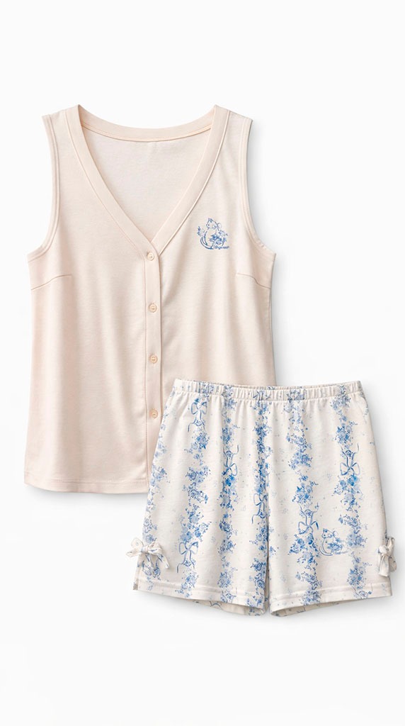 El pijama Bella Nuit en tono beige es una propuesta elegante y delicada pensada para disfrutar del descanso con estilo. Su diseño combina una camiseta lisa en tono crema con escote en pico y botones frontales, junto a un pantalón corto con estampado floral azul que aporta un aire romántico y femenino.