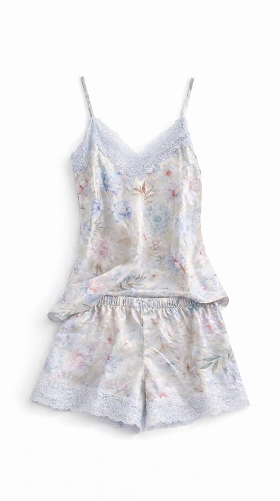 El top presenta tirantes finos y escote en pico con encaje, aportando un aire romántico y ligero. Su tejido satinado cae suavemente sobre el cuerpo, ofreciendo una silueta cómoda y muy favorecedora. El short, con cintura elástica, se adapta fácilmente y está rematado con encaje en el bajo, completando el conjunto con un acabado delicado.