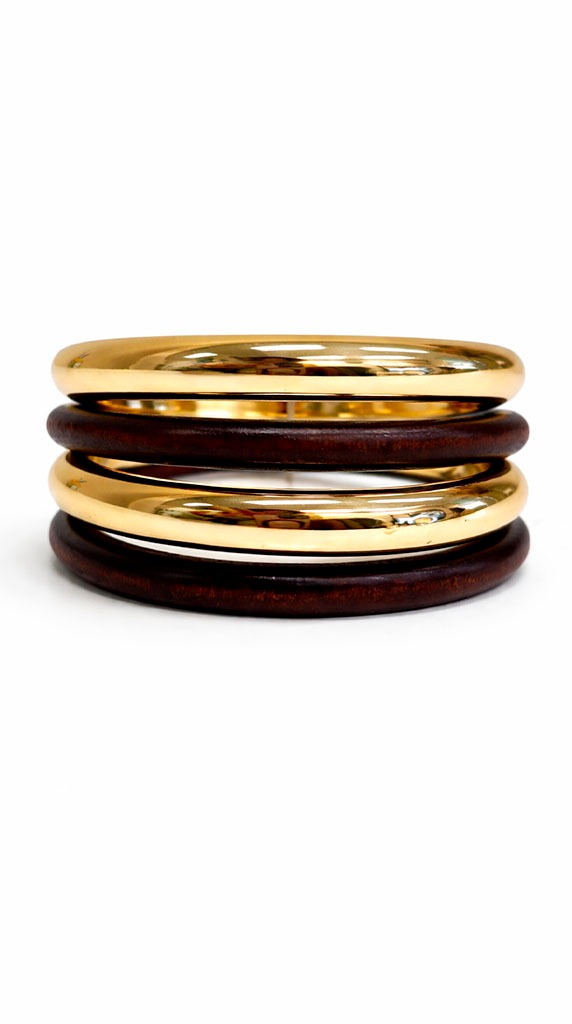 Este pack de pulseras Capri combina la calidez de la madera en tono marrón oscuro con el brillo sofisticado del metal en acabado dorado. Una mezcla equilibrada que aporta personalidad y estilo, perfecta para elevar cualquier look de forma sencilla y elegante. Ideal tanto para el día a día como para completar looks más arreglados, aportando un toque natural y sofisticado a la vez.