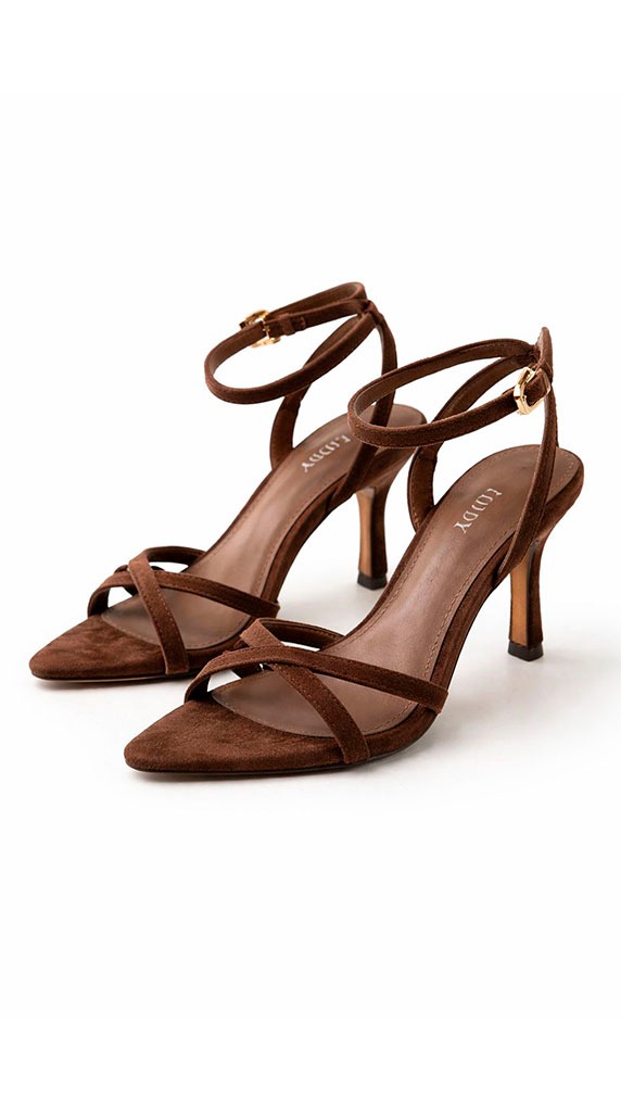 Sandalia de tacón medio en acabado efecto ante color chocolate, con diseño de tiras finas cruzadas en el empeine que estilizan visualmente el pie y aportan un aire elegante y femenino.