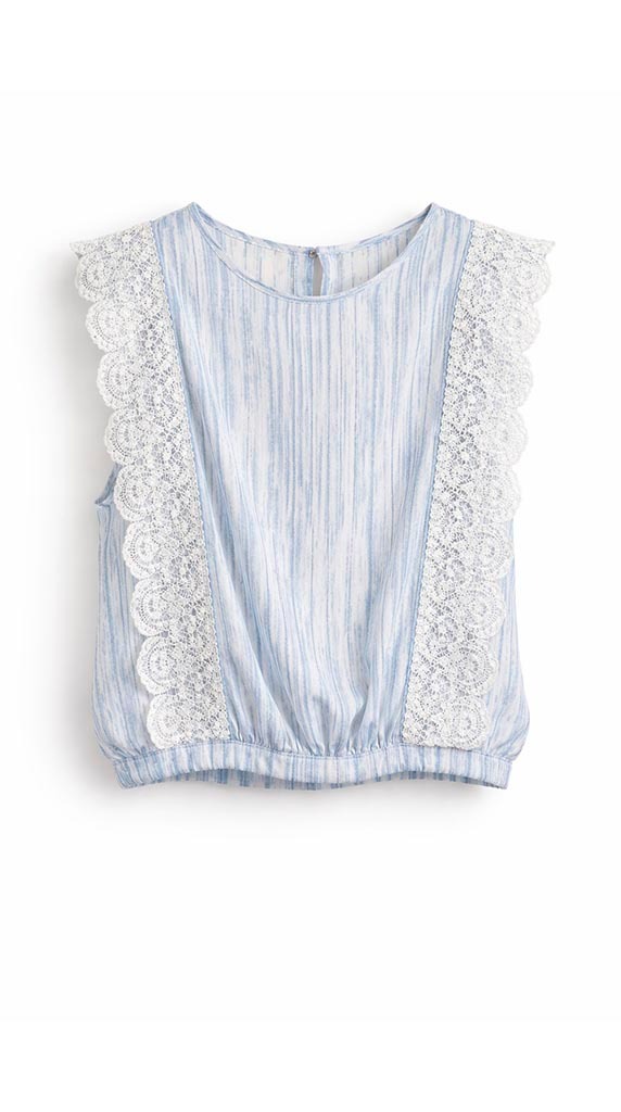 Top de estilo fresco y delicado con estampado en tonos azules que aporta luminosidad y un aire muy veraniego al look. Su diseño combina un tejido ligero con caída suave y detalles de encaje en contraste, creando una prenda femenina y con mucho encanto.