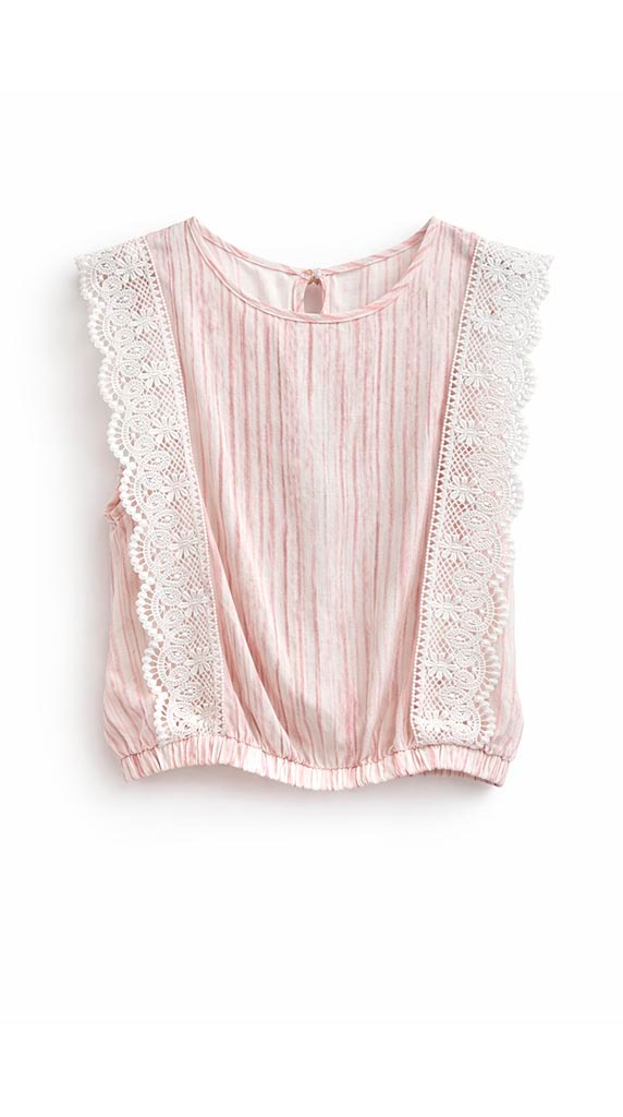 Top de estilo fresco y delicado con estampado en tonos rosa suave que aporta luminosidad y un aire muy romántico al look. Su diseño combina un tejido ligero con caída fluida y detalles de encaje en contraste, creando una prenda femenina y con mucho encanto.