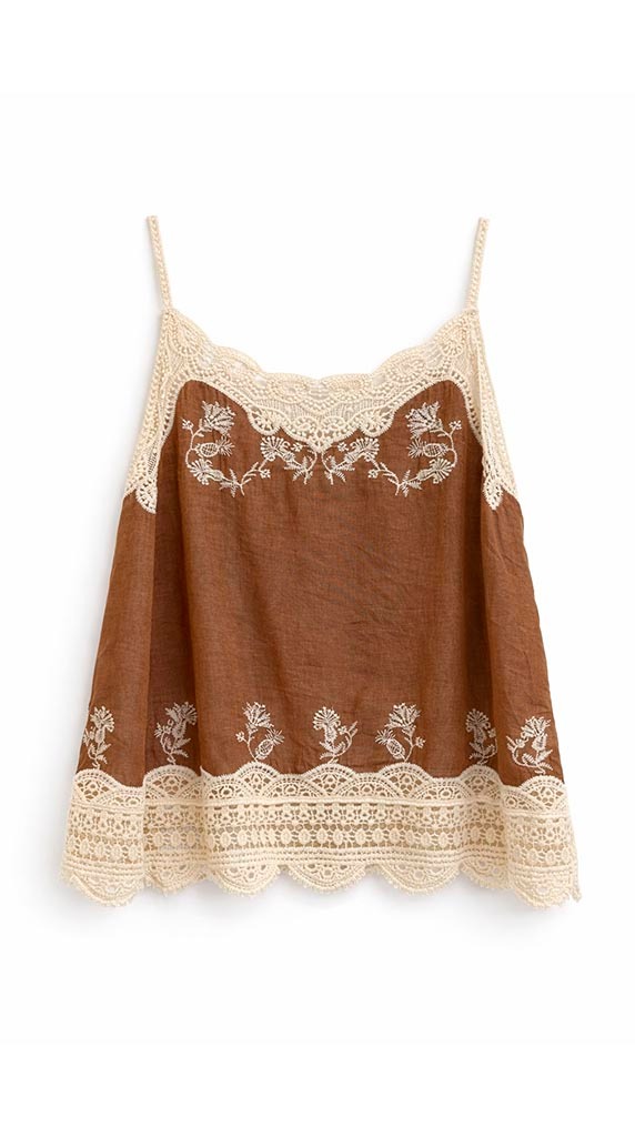 El Top Lencero Bordado Marrón es una prenda delicada y muy femenina que destaca por su diseño romántico y sus bonitos detalles de encaje y bordado. Su escote con encaje decorativo aporta un acabado elegante y muy especial que realza la zona del escote.