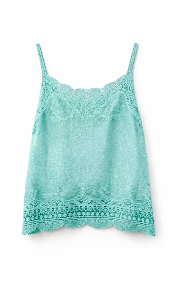 Top en tono verde agua con detalles bordados y acabado calado que aportan un aire fresco, femenino y muy favorecedor. Su diseño ligero y delicado lo convierte en una prenda ideal para los días de calor.