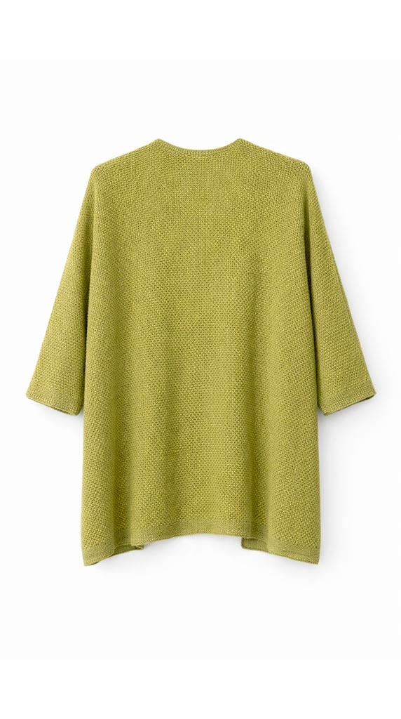 Su escote en pico estiliza la parte superior, alargando visualmente el cuello y afinando la zona del pecho. El tejido de punto fino tiene una caída fluida que no marca y favorece diferentes tipos de silueta.