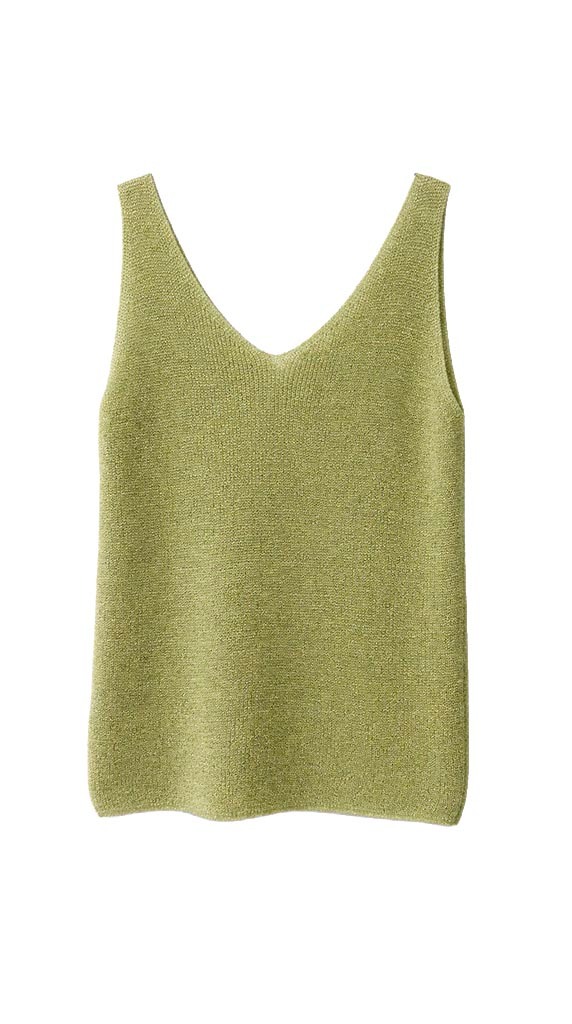 Top de punto en tono verde oliva con acabado en lurex que aporta un brillo sutil y elegante, ideal para dar un toque especial sin excesos.