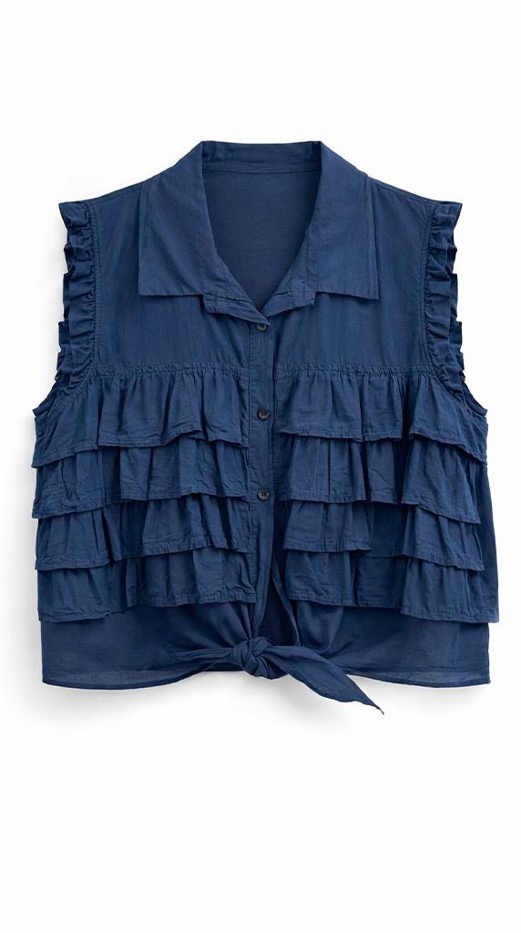 Top de algodón en tono marino con diseño femenino y favorecedor. Presenta cuello camisero y cierre frontal con botones, combinado con volantes en capas que aportan movimiento y un toque romántico sin perder elegancia. Su bajo con lazada permite ajustarlo sutilmente, marcando la silueta de forma natural.