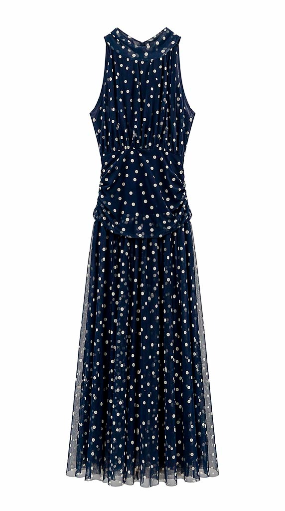 Vestido en tono marino con estampado de lunares, una opción elegante y muy favorecedora que estiliza al instante. Su tejido de viscosa, ligero y fluido, aporta movimiento y una caída impecable que acompaña el cuerpo sin marcar.