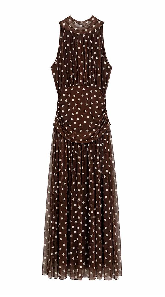Vestido en tono marrón chocolate con estampado de lunares, una pieza elegante y muy favorecedora que nunca pasa de moda. Su tejido de viscosa, ligero y fluido, aporta una caída preciosa que acompaña el movimiento y estiliza la silueta sin marcar.